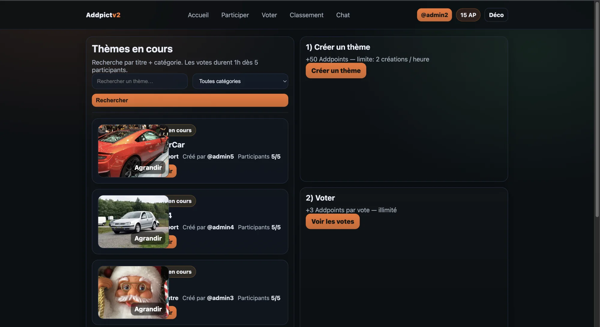 Recherche par titre + catégorie. Les votes durent 1h dès 5 participants.